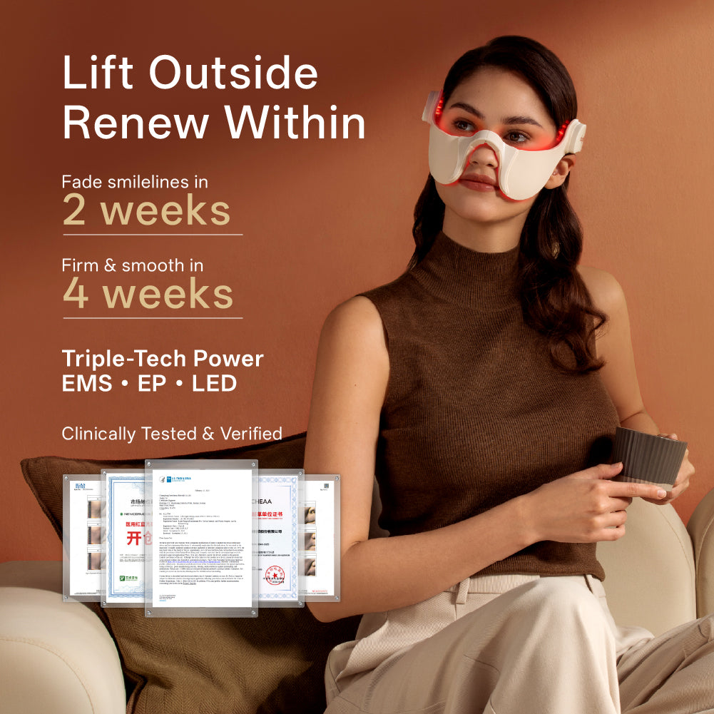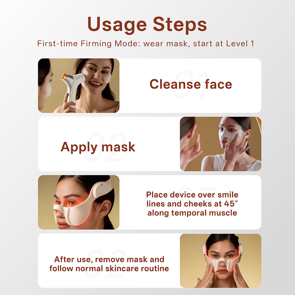Light Therapy + EMS+EP: Lifts from the temples to reduce smile lines and enhance cheek fullness.